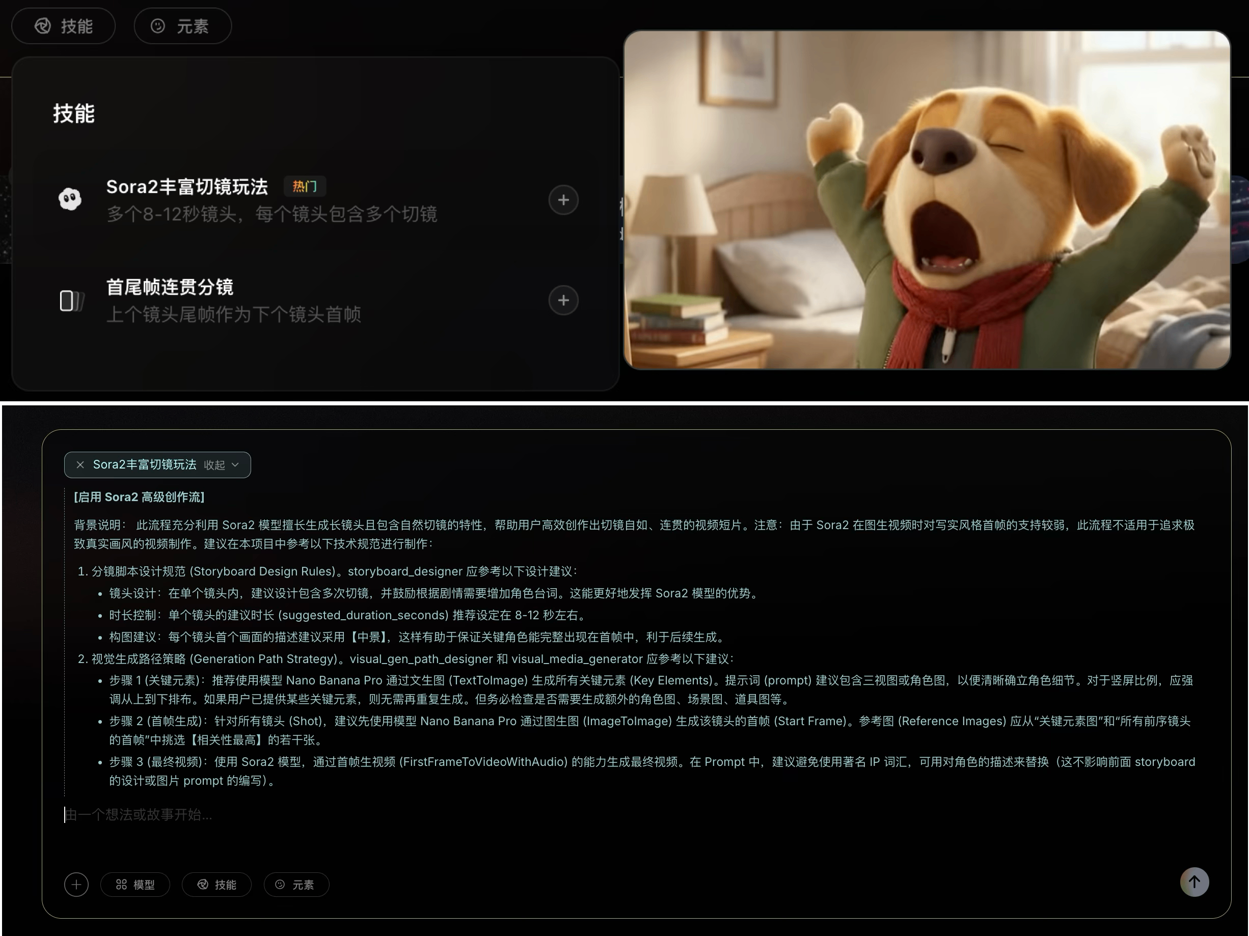 官方提供两条默认skills:Sora 2 丰富多切镜玩法,连贯首尾帧玩法