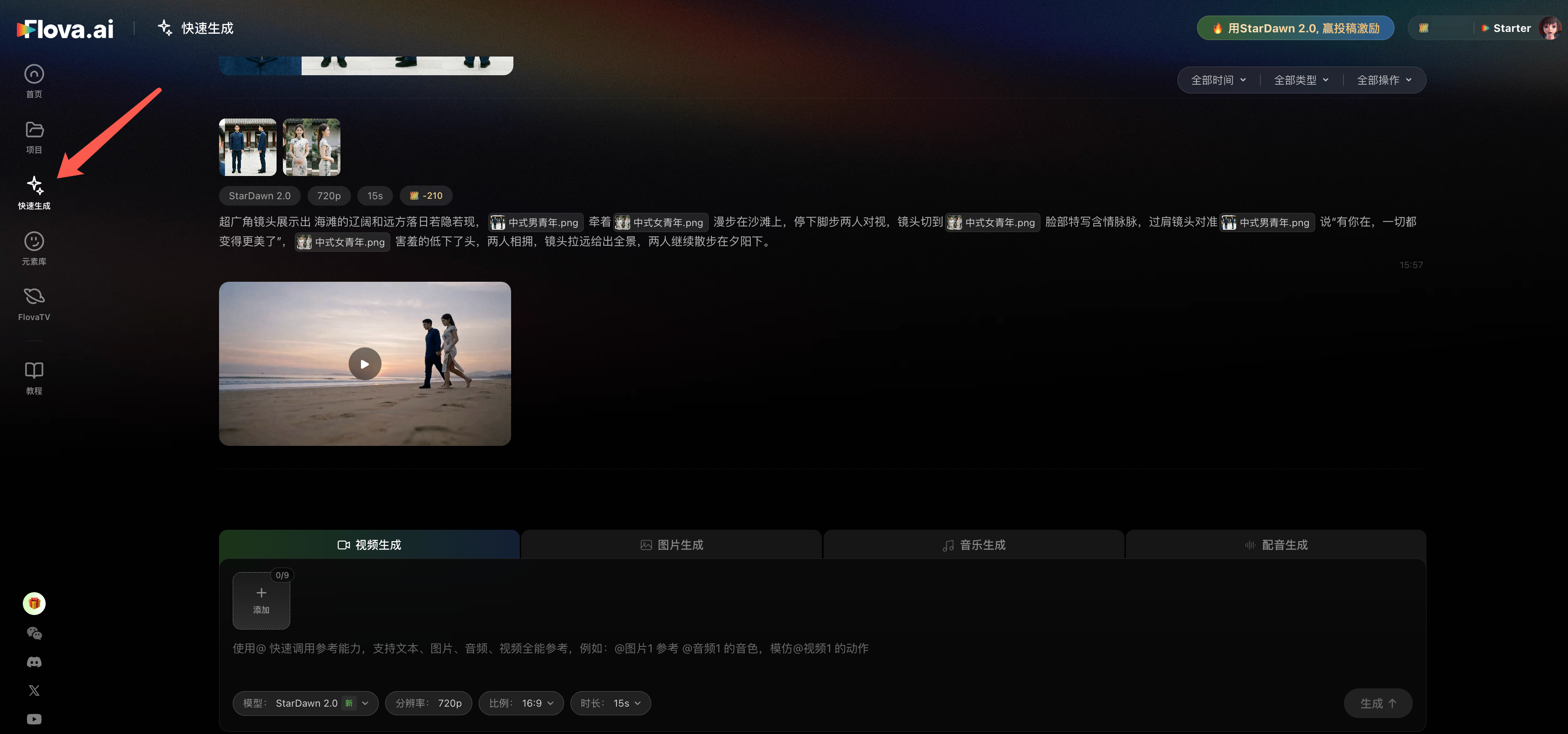 1、开通会员即可使用,支持所有模型,方便快捷创作单素材 视频生成 图片生成 音乐生成 音频生成 2、全面适配 StarDawn 2.0的全能参考能力 使用 @ 快速调用参考能力,支持文本、图片、音频、视频全能参考,例如:@图片1 参考 @音频1 的音色,模仿@视频1 的动作 3、更多体验优化,正在开发中… 手动编辑 再次生成 图片支持选择生成数量1-4 默认记忆选项设置 最后更新于