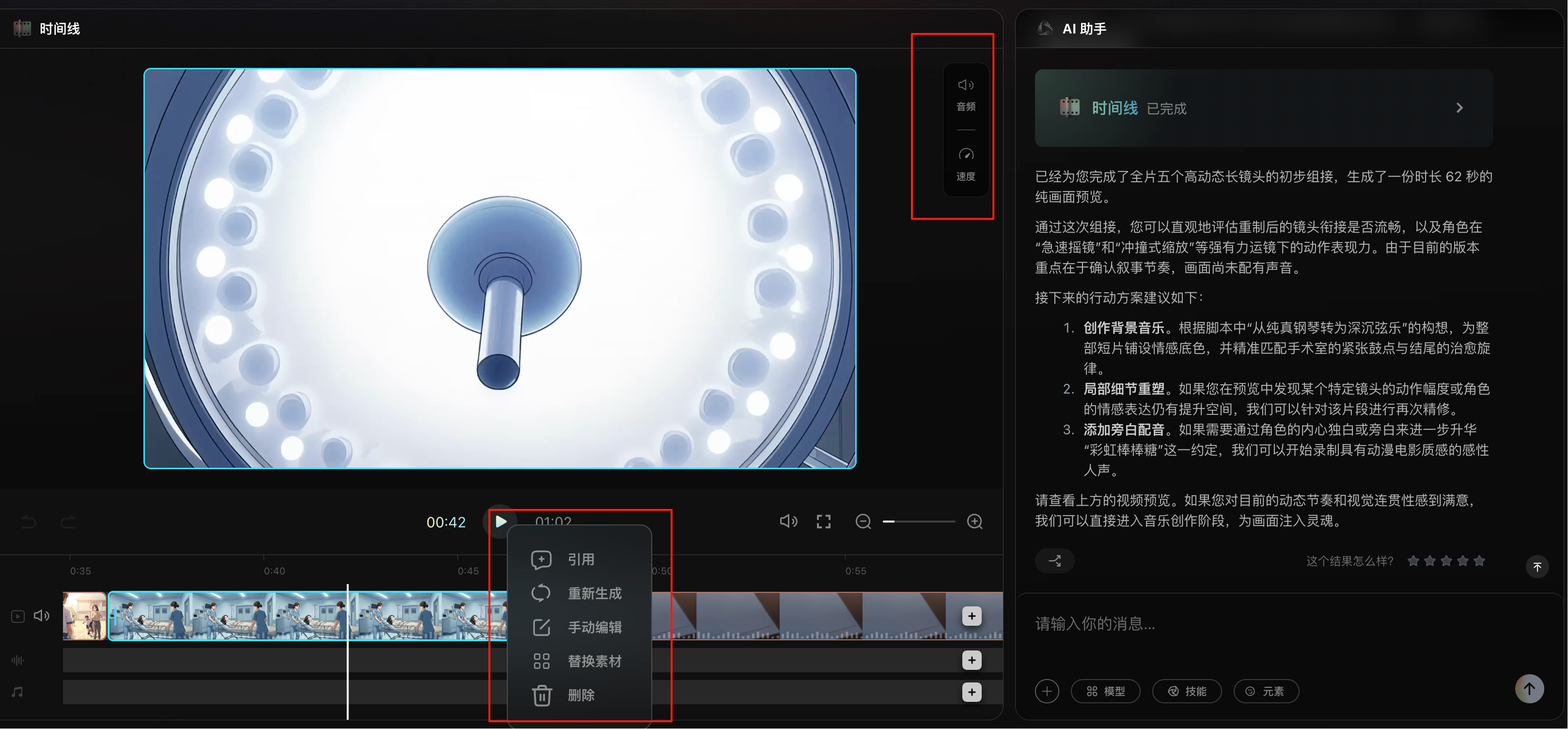 - 右键某个视频片段,可以引用、重新生成、手动编辑、替换素材、删除