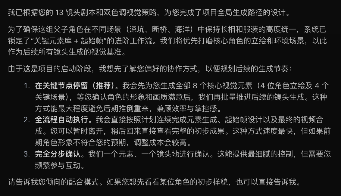- 持续的对话创作:Flova 智能规划创作步骤,并在关键产物生成后提供下一步建议等待你确认后持续创作,也能听懂你的主观建议或想法。