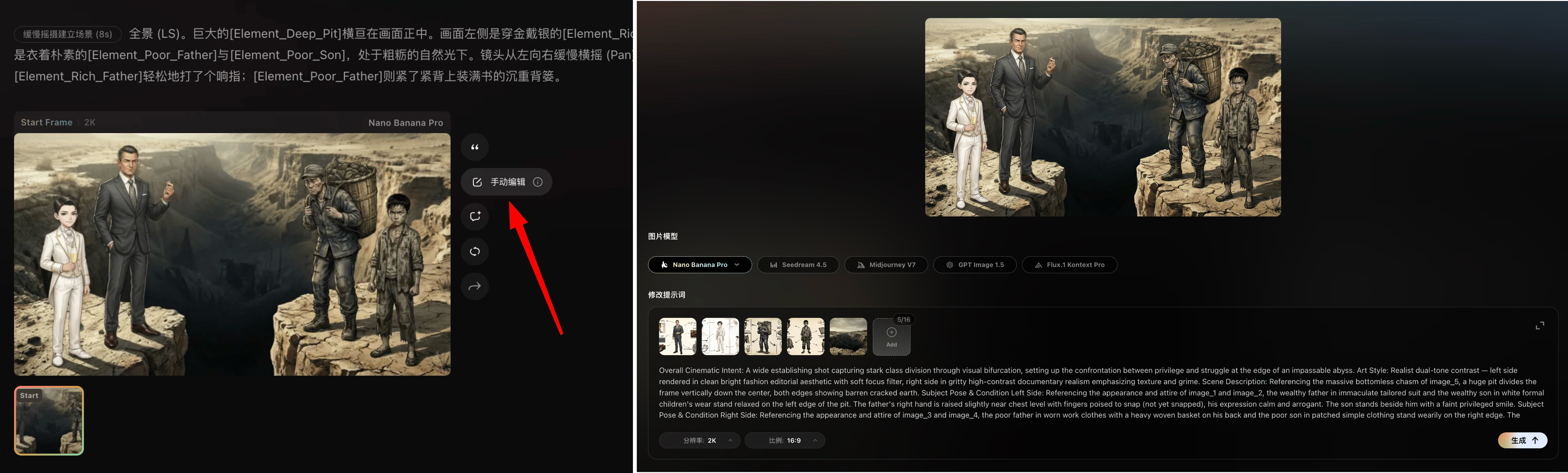 - 故事板手动编辑:支持调整模型、提示词、参考图、生成方式(文生视频、首帧生视频、首尾帧生视频)、提示词、清晰度、时长等
