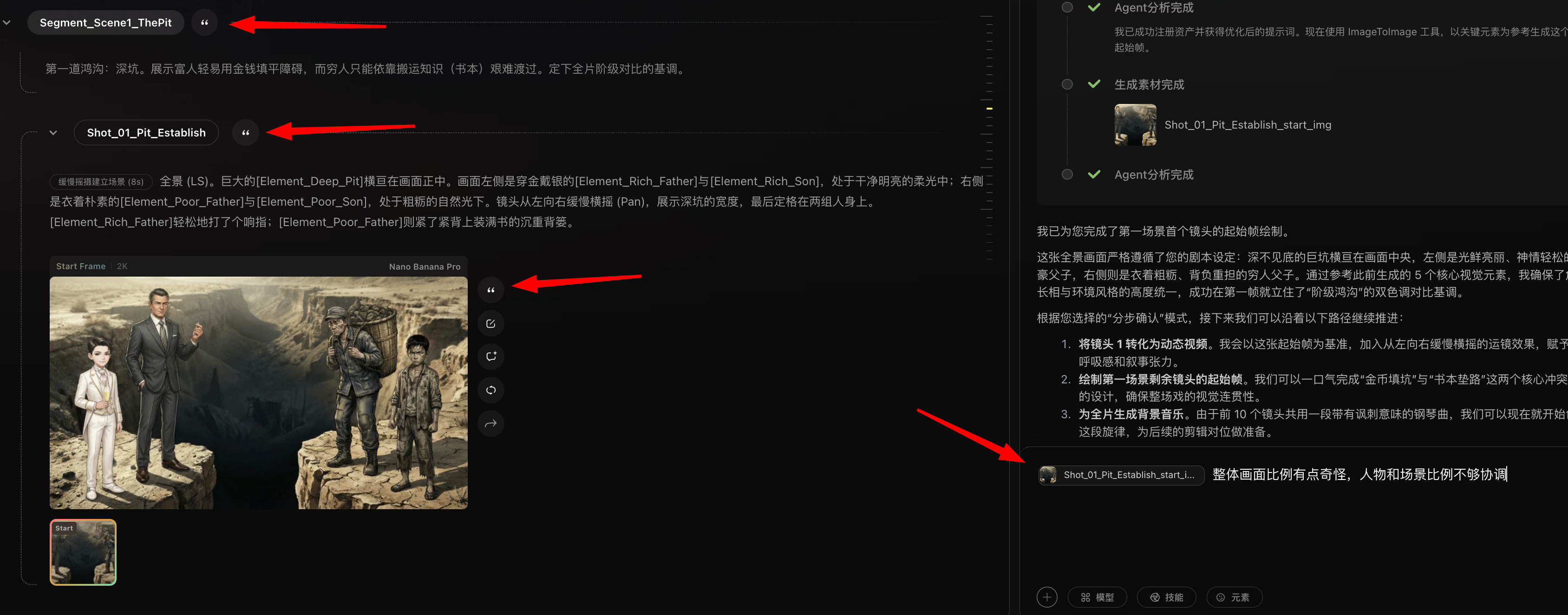 - 故事板评论生成:可在故事板针对具体的镜头的任意素材,输入大白话评论生成,与对话流并行,效率更高