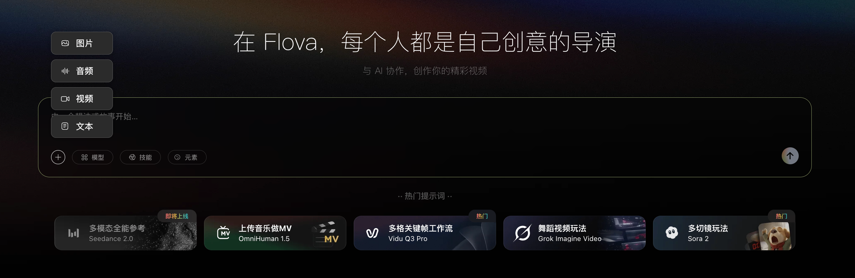 选择模型:Flova 集成业内最先进的图/视频/音频模型(Nano Banana Pro/Seedance 2.0(接入中)/Kling 3.0/Sora 2 Pro/Veo 3.1/Suno v5 等),图片默认 Nano Banana Pro,视频默认 Seedance 1.5 Pro,音频默认 Suno v5,可根据需要自由指定模型