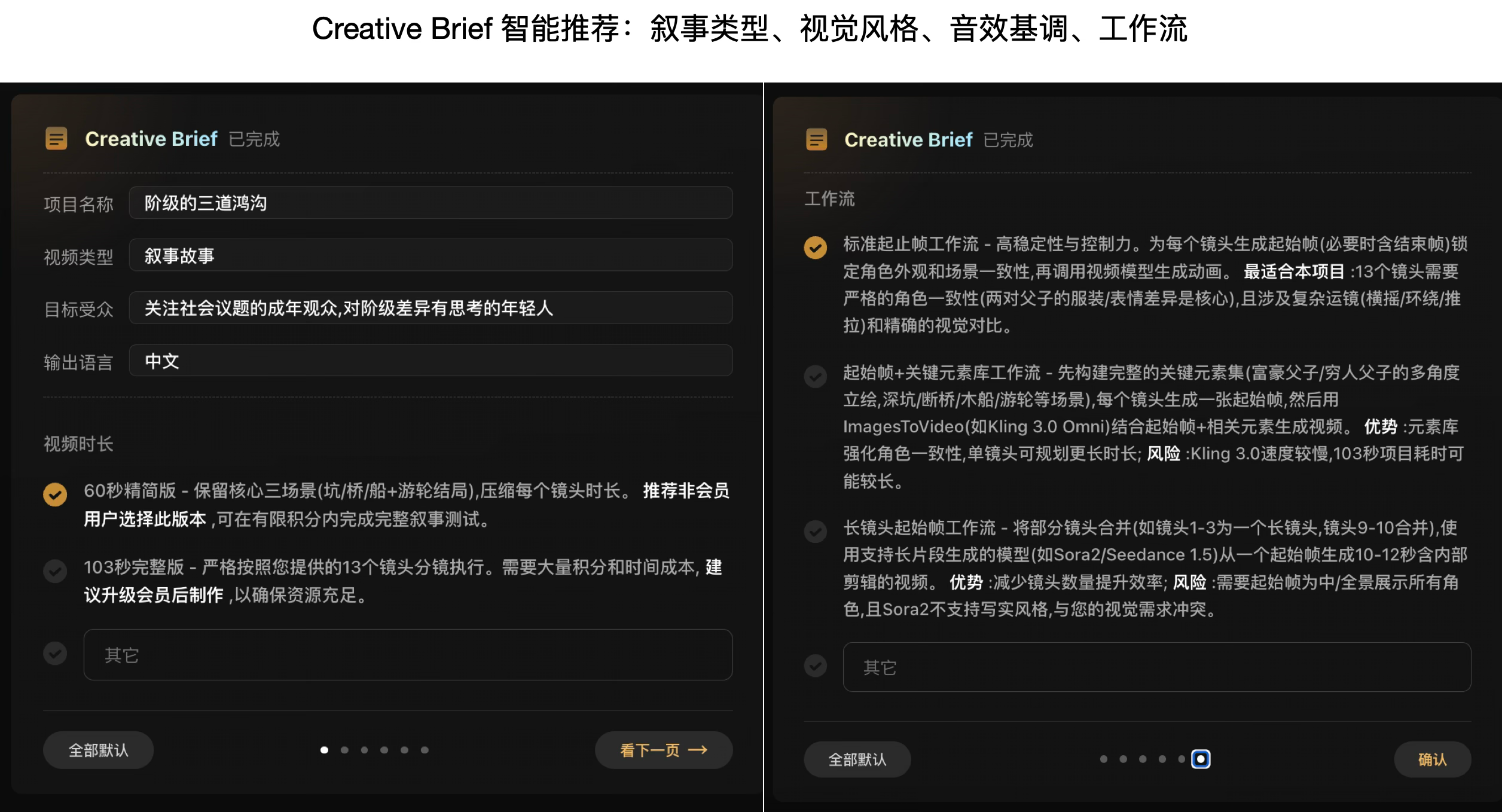 创作需求描述得越具体,Flova 响应得越准确,包括主角特征、故事内容、画面比例、视频语言、视频画风等,Flova也会智能提供创意简报供你的确认。